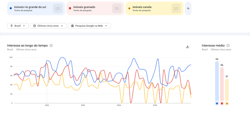 Outro ponto interessante é que o interesse por imóveis em cidades turísticas do Sul pode ser medido também pelas pesquisas online. Nos últimos 5 anos, alguns termos envolvendo compra de imóveis e locação de apartamentos no estado do Rio Grande do Sul como um todo vem crescendo de forma estável, enquanto que em cidades como Gramado e Canela os dados mostram picos nos meses que antecedem feriados prolongados e durante o inverno, indicando uma concentração de investidores que se planejam antes da alta temporada turística. Segundo dados do Google Trends, a busca por ‘imóveis Gramado’ cresce, em média, 25% nos períodos que antecedem feriados e temporadas de inverno, mostrando que o interesse pelo mercado imobiliário da região aumenta em todo o Brasil e reforçando a importância de decisões rápidas e informadas.